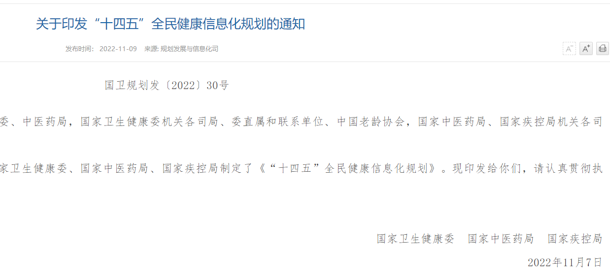 為貫徹落實(shí)黨中央、國務(wù)院的決策部署,統籌推動(dòng)全民健康信息化建設,進(jìn)一步推進(jìn)新一代信息技術(shù)與衛生健康行業(yè)深度融合,將數字技術(shù)與系統思維貫穿到健康中國、數字中國建設的全過(guò)程,充分發(fā)揮信息化在衛生健康工作中的支撐引領(lǐng)作用,國家衛生健康委聯(lián)合國家中醫藥局和國家疾控局根據全民健康信息化工作面臨的新形勢新任務(wù),堅持“統籌集約、共建共享,服務(wù)導向、業(yè)務(wù)驅動(dòng),開(kāi)放融合、創(chuàng )新發(fā)展,規范有序、安全可控”的基本原則,以引領(lǐng)支撐衛生健康事業(yè)高質(zhì)量發(fā)展為主題,編制印發(fā)《“十四五”全民健康信息化規劃》(以下簡(jiǎn)稱(chēng)《規劃》)。
